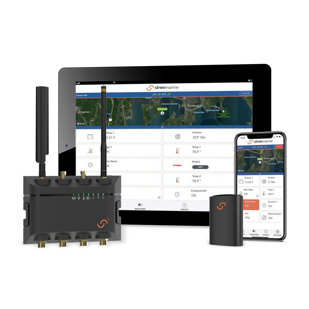 The Siren 3 Pro is the most advanced Main Device offered by Siren Marine. Together with the Siren Connected Boat App, Siren Marine's Smart Boat Monitoring System puts your boat in the palm of your hand 24/7. Install the Siren 3 Pro on your boat to monitor and track multiple critical systems such as battery voltage, bilge pump activity, water levels, shore power status, engine performance, temperature, location & more right on the App. Some monitoring capabilities require a Siren 3 Series Wireless Sensor or Wired Sensor.