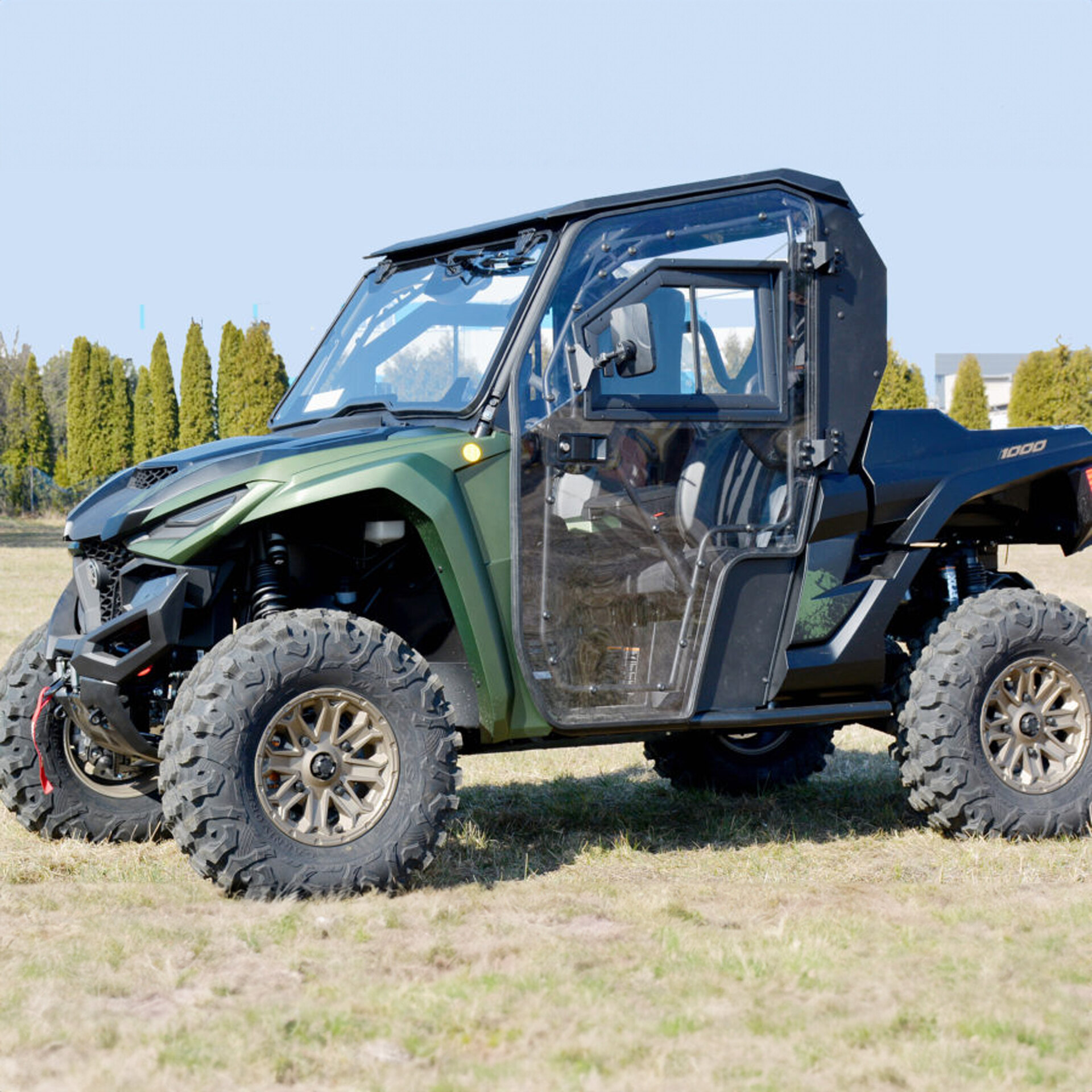 • Tempered safety glass front windshield.