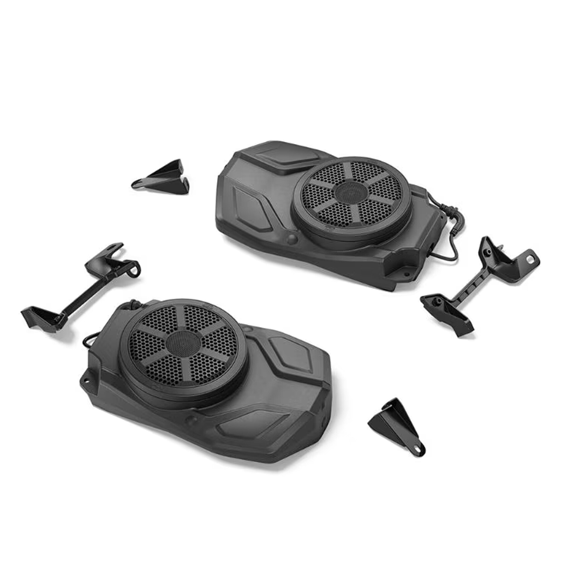 • Note: Kit includes two speakers that can be used in either doors of 2025+ Wolverine RMAX4 1000 XT-R models or overhead in Wolverine RMAX4 1000 Compact models using provided mounts.